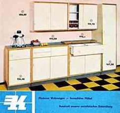 | | | | | MÖBEL UND WOHNRAUM - "Titelbild: Der VEB Holzverarbeitungswerk Burg bei Magdeburg stellte zur Leipziger Herbstmesse 1966 dieses weiterentwickelte Anbauküchenmodell aus, in das auch die Waschmaschine mit einbezogen wurde." (1966)