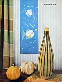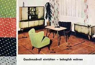 "Auch die kleinste Vase wird in der kapitalistischen Gesellschaft zu einem Gegenstand des Profitstrebens, und wie oft ist der Inhalt des bürgerlichen Lebens "Mehr scheinen als sein". Alles muß wertvoll aussehen, und wenn es das billigste Talmi ist. Das fängt beim "Stilmöbel" an, das mit dem wirklichen nur die Tatsache gemeinsam hat, daß es viele Schnitzarbeiten aufweist, aber beileibe keinen Stil. Das geht über zu dem schweren Bleikristall - je größer und geschliffener die Schale, desto besser der Eindruck von Wohlstand -, und es endet bei den Nippesfiguren und den Filetdeckchen auf allen Möbeln. Wer kennt nicht Tante Almas "Gute Stube", die nur für Ehrengäste benutzt wurde! Unsere Lebensauffassung ist anders. Dem Wesen der sozialistischen Gesellschaft widerspricht es, mit äußeren Dingen Eindruck schinden zu wollen. Eindruck hinterläßt bei uns die Leistung der Persönlichkeit für die Gesellschaft. So einfach, klar und schön, wie die Beziehungen der Menschen in der sozialistischen Gesellschaft sind, so einfach und schön wollen wir auch wohnen. Unsere Wohnungen sollen Lebensfreude atmen; in ihnen will man sich erholen, neue Kräfte schöpfen. Da ist kein Platz für kleinbürgerlichen Schwulst, den es leider auch in unseren Geschäften noch so oft zu kaufen gibt. Man sieht: Es ist schwer, die Vergangenheit, ihre Traditionen und Gewohnheiten zu überwinden." - Aus dem Kalender "Kultur im Heim 1960"  | |