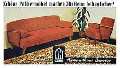 | |  | Versandhaus Leipzig - "Schöne Polstermöbel machen Ihr Heim behaglicher!", Katalogabbildung (1960) | | Versandhaus Leipzig - "Die moderne Raumgestaltung bevorzugt farbenfrohe Effekte, besonders in bezug auf Polstermöbel. Mit "Romeo" und "Julia" bieten wir Ihnen eine ansprechende und besonders durch ihre schönen Farben wirkende Garnitur an.", Katalogabbildung (1960) |