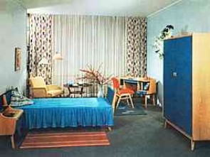 | Kalender "Kultur im Heim 1960" - Das "Bild zeigt einen Raum, der der Größe des Wohnraues vom Typ TW entspricht ind der zum Wohnen und Schlafen dienen soll."