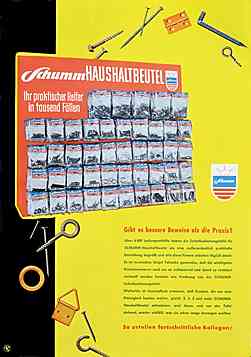 Die Menschen arbeiten nicht nur in ihren Betrieben mit viel Eifer und Pflichterfüllung, sondern auch zu Hause. Ist es da ein Wunder, wenn die "Mach-es-selbst-Bewegung" nach Amerika gerade bei uns – besonders gefördert durch die 5-Tage-Woche – einen unglaublichen Aufschwung nahm wie vor wenigen Jahren die Camping-Bewegung? – Wir können eben nicht anders, als unsere Freizeit arbeitend oder bastelnd auszunützen. – Spezialzeitschriften, Fachblätter jeder Berufssparte, Illustrierte und Tageszeitungen geben laufend Anregungen über die Freizeitgestaltung. – Immer mehr sucht der Verbraucher für diesen Zweck Nägel, Schrrauben usw. in Kleinpackungen, die er übersichtlich aufbewahren und rasch einkaufen kann. Was liegt es da für Sie näher, als sich sofort mit unseren SCHUMM-Haushaltbeuteln mit Kleineisenwaren einzudecken? Es gibt doch nichts Praktischeres für den Verbraucher – und Sie haben ein leichtes Verkaufen." - Aus einem Schreiben der Erich Schumm GmbH an den Einzelhandel