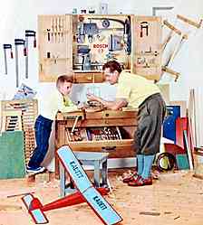Glücklich kann sich schätzen, wem für seine Heimwerkeraktivitäten ein spezieller Raum zur Verfügung steht, doch „wer keine komplett ausgerüstete Heimwerkstatt hat, braucht deshalb nicht auf die Freude am selbstgefertigten Werkstück zu verzichten“. Man kann auch im Wohnzimmer erbaulich heimwerken, muss dort jedoch selbstverständlich „auf die lieben Angehörigen Rücksicht nehmen“. Und „da die Küche ohnehin im gewissen Sinn eine Werkstatt, und zwar die der Hausfrau ist, kann sie meistens auch als Asyl für die Heimwerkstatt dienen. Am besten wäre es natürlich, wenn sie dort einen eigenen Werktisch aufstellen könnten“. - Eine sicherlich gut gemeinte Anregung, aber es gehört wahrlich nicht allzu viel Phantasie dazu, sich auszumalen, wie viele Ehefrauen angesichts ihrer fortan in der Küche werkelnden Männer einen solchen Vorschlag insgeheim oder auch lauthals verflucht haben mögen.