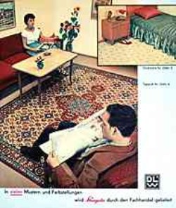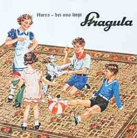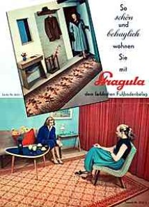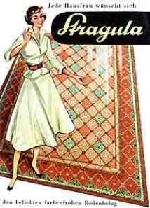 "Jede Hausfrau wünscht sich Stragula den beliebten farbenfrohen Bodenbelag" (schätzungsweise um 1955)