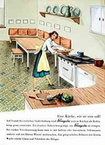 "Eine Küche, wie sie sein soll! Auf Grund der einfachen Sauberhaltung wird Stragula auch in Küchen als Bodenbelag gerne verwendet." (schätzungsweise um 1955)