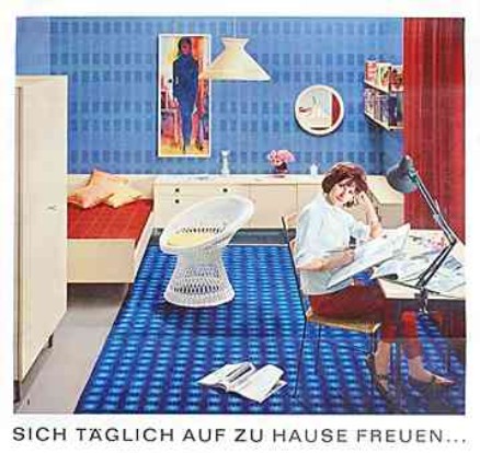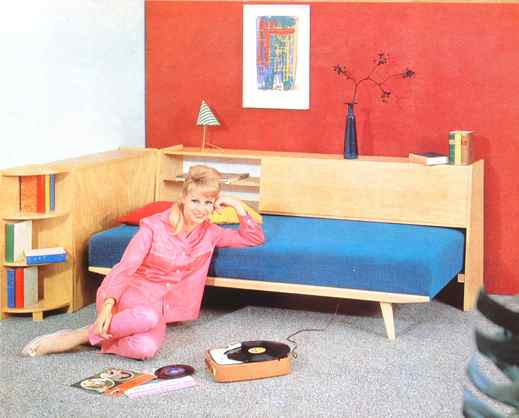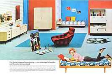 |  | "Die ideale Junggesellenwohnung - dem Lebensgefühl moderner Menschen entsprechend, die Vorliebe für strengen Aufbau haben und ihrem Zuhause den Stempel eines persönlichen Geschmacks verleihen möchten, dazu ist das Wohnschlafzimmer "Jenny" hervorragend geeignet." (1962)