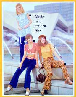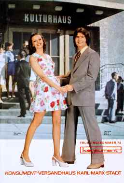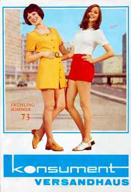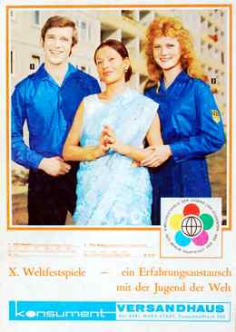 Unübersehbar ist auch eine zunehmende Orientierung zum Westen hin, die im konsument- "Festivalkatalog" aus dem Jahr 1973 ihren Höhepunkt findet.Anlässlich der 10. Weltfestspiele der Jugend, „die die Jugend der Welt in Berlin, der Hauptstadt der DDR zusammenführen werden“, gibt man sich international und schreckt auch vor Berührung mit dem für den DDR-Normalbürger unerreichbaren kapitalistischen Ausland nicht zurück. So werden die Kleider diesmal nicht nur nach Städten wie Aue, Ahlbeck, Usedom und Prag benannt, sondern genauso nach Bremen, Aachen, Basel oder Hawaii. Hinzu kommen „Exoten“ wie der Hosenanzug „Kongo“ oder die Mädchenhose „Bagdad“. Auch eindeutig westliche Namen wie Ted, Judy oder Douglas werden herangezogen, die Krönung bilden aber sicherlich die Gürtelhose „Jupp“ und die Rundbundhose „Heino“. Dies ging den politisch Verantwortlichen dann doch zu weit, in einigen Teilauflagen des Kataloges wurden die entsprechenden Stellen geschwärzt und auch die Nachfolgekataloge ließ keine Zweifel mehr offen, welche Staaten als „Freundesland“ zu gelten hatten.