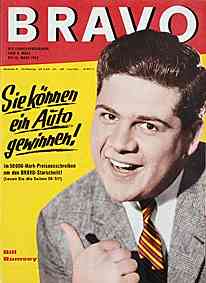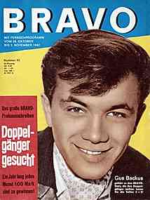 | |  | | | BRAVO - Titelbild: Bill Ramsey - Themen z.B.: "Ich finde Twist häßlich!", "Charlton Heston - Das große Rennen" | | BRAVO - Titelbild: Gus Backus - Themen z.B.: "Die neue Valente-Fernsehshow", "Was denken sich die "Herren der Schöpfung"? - Problem: Sie wollen mehr als nur Küsse", "Ich heiratete in Gretna Green" | | |