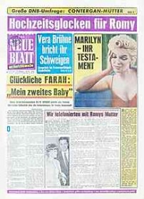 | | Das Neue Blatt - Titelthemen: "Contergan-Mütter", "Hochzeitsglocken für Romy", "Vera Brühne bricht ihr Schweigen", "Glückliche Farah", "Marilyn - ihr Testament"