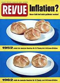 | REVUE - Titel: "Inflation? Unser Geld darf nicht gefährdet werden! - 1952 erhielt die deutsche Hausfrau für 18 Pfennig drei 50-Gramm-Brötchen - 1962 erhält die deutsche Hausfrau für 18 Pfennig zwei 50-Gramm-Brötchen" | | QUICK - Titelthema: "Wirtschaftskrise? QUICK prophezeit: Die fetten Jahre kommen erst!" - Weitere Themen z.B.: "Fertighäuser werden salonfähig", "Zu früh zu alt - Frühreife der Kinder"